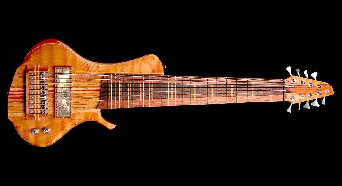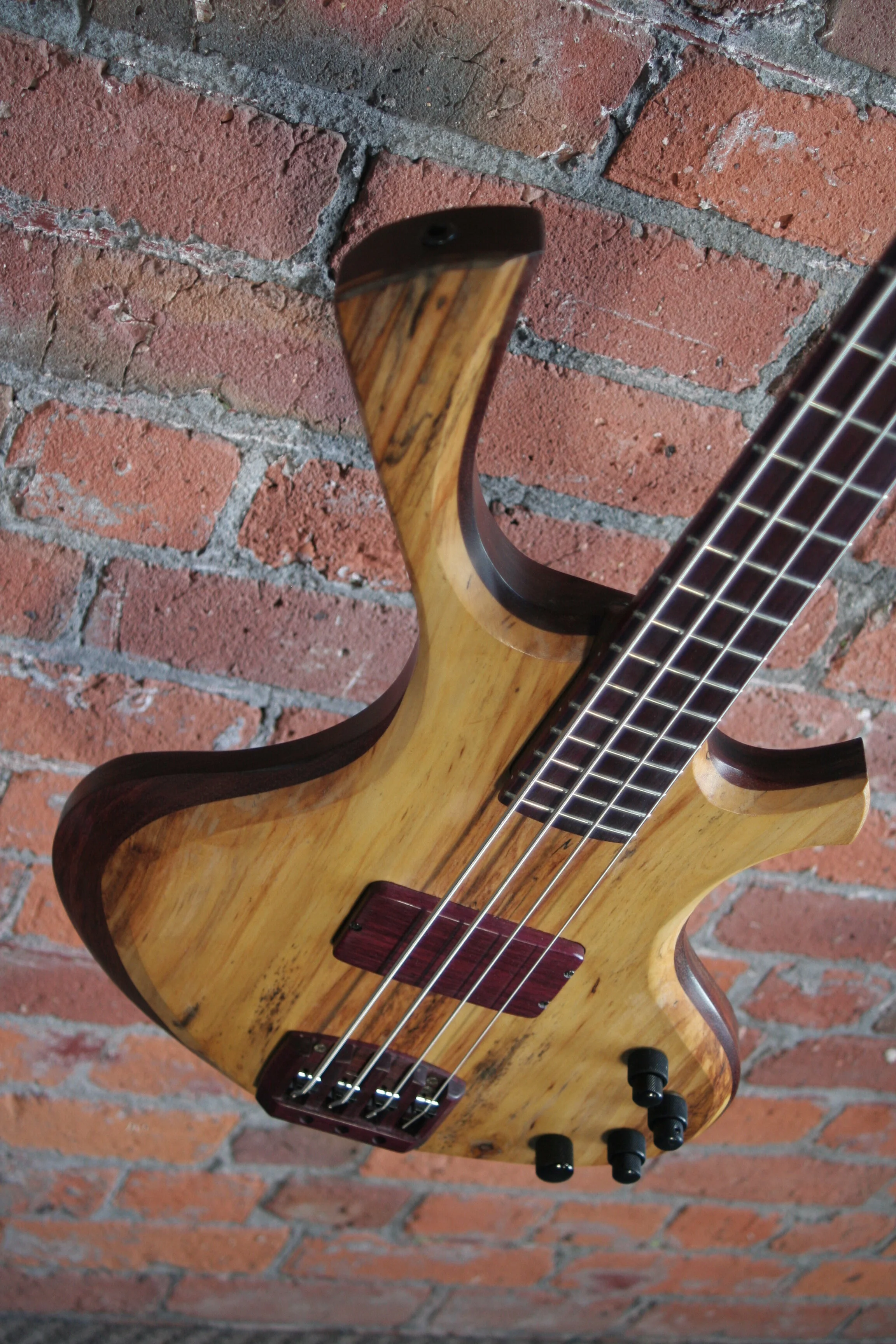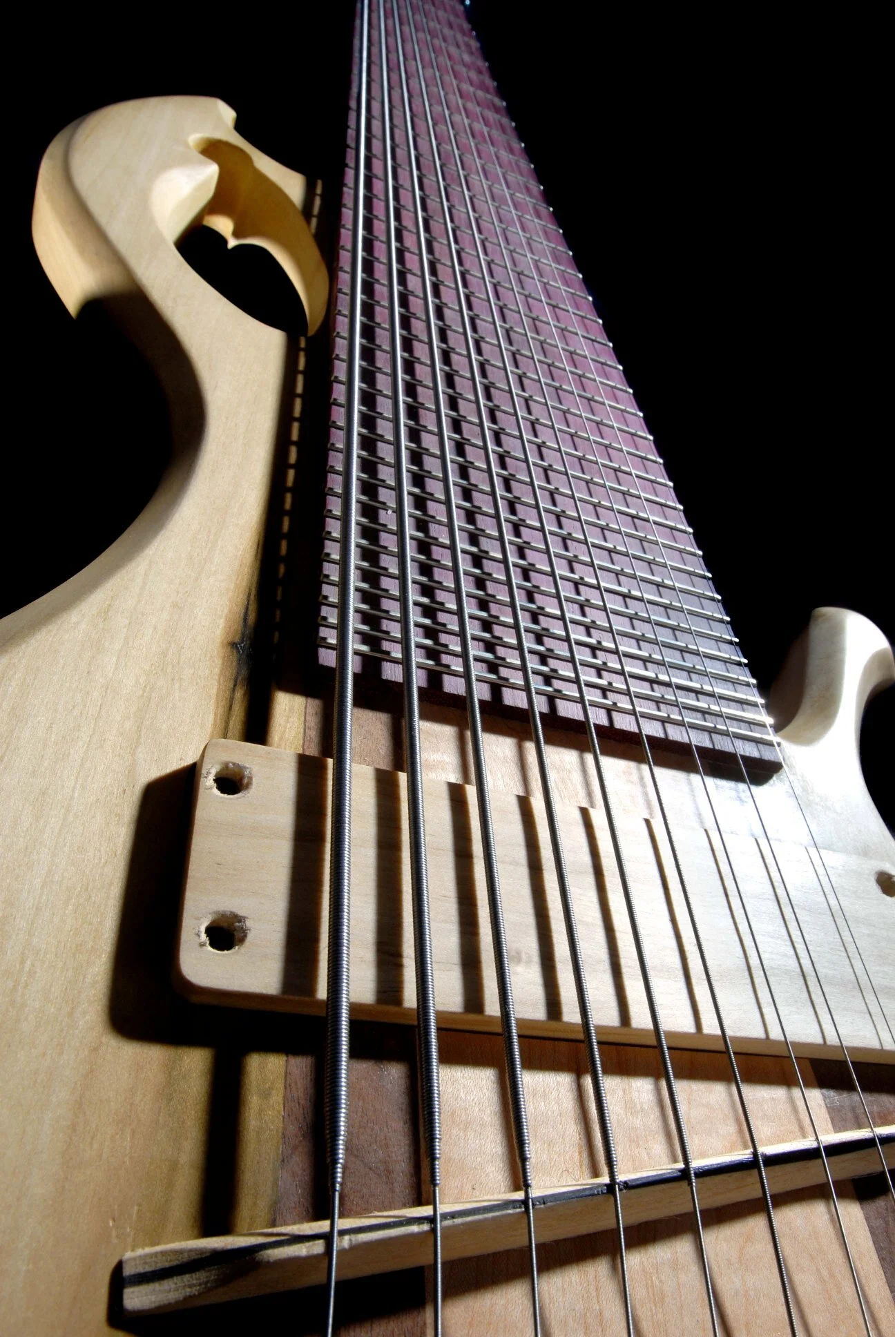 The Seax bass is a single cutaway, through neck bass, with a top horn inspired by the medievalsword of the same name. A single cut with extended upper bout gives the neck extra stability, so is great for multiple strings. It's available in both standard and offset body shape. The Seax bass is fully customisable in electronics, headstock, wood choices etc. My preference for this bass is to really push the boundary or range, and really load it up with strings.